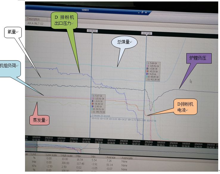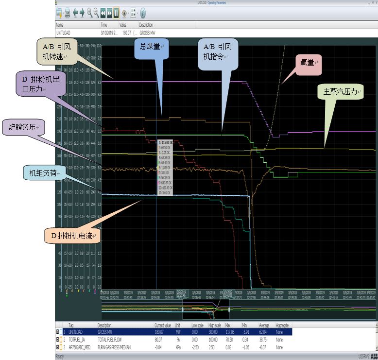 附1、2號(hào)爐運(yùn)行參數(shù)曲線。第一張圖曲線對(duì)應(yīng)參數(shù)分別為:1:機(jī)組負(fù)荷,2:總煤量,3:爐膛負(fù)壓,4:A引風(fēng)機(jī)指令,5:B引風(fēng)機(jī)指令,6:主蒸汽壓力,7:D排粉機(jī)出口風(fēng)壓,8:D排粉機(jī)電流,9:A引風(fēng)機(jī)轉(zhuǎn)速,10:B引風(fēng)機(jī)轉(zhuǎn)速,11:氧量。
