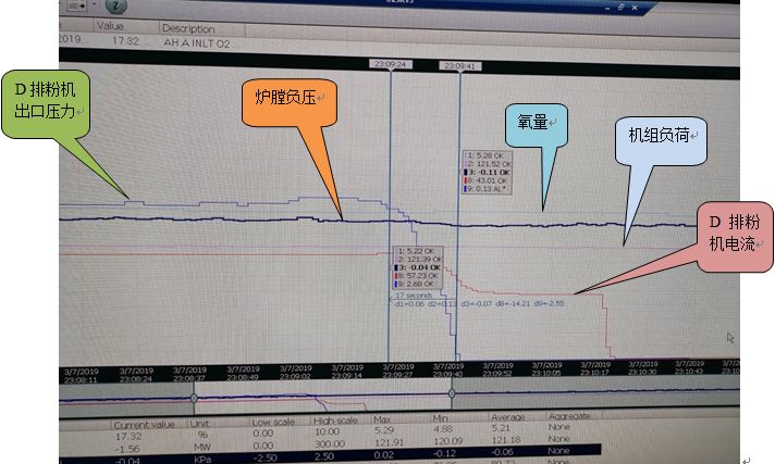 事件經(jīng)過(guò): 3月8日,20:30,因粉倉(cāng)平均粉位低于2米,值長(zhǎng)令啟動(dòng)#4排粉機(jī)制粉。 3月9日,2:31,粉倉(cāng)平均粉位已經(jīng)在3米以上,值長(zhǎng)令停止D排粉機(jī)運(yùn)行。 2:33,分別增加A、B、C、D層給粉機(jī)轉(zhuǎn)速20-30rpm,停止E4給粉機(jī)運(yùn)行。 2:34,停止E2給粉機(jī)運(yùn)行。 2:35, D排粉機(jī)出口風(fēng)壓2.5KPa,開(kāi)始降低風(fēng)壓。 2:37:34,D排粉機(jī)出口風(fēng)壓降低到0.03KPa,爐膛負(fù)壓-0.08KPa,A、B引風(fēng)機(jī)指令63/63,轉(zhuǎn)速624/631RPM。 2:37:36,爐膛負(fù)壓-0.17KPa,A、B引風(fēng)機(jī)指令62/62,轉(zhuǎn)速624/631RPM。 2:37:38,A、B、C、D層及E1、E3給粉機(jī)火檢強(qiáng)度均大于50%,爐膛負(fù)壓-0.36KPa,A、B引風(fēng)機(jī)指令62/62,轉(zhuǎn)速624/631RPM。 2:37:39,C2、D3給粉機(jī)火檢強(qiáng)度小于50%。爐膛負(fù)壓-0.39KPa。 2:37:40,C2、D3給粉機(jī)火檢強(qiáng)度小于50%。爐膛負(fù)壓-0.46KPa。 2:37:41,A2、B4、C1、C2、D2、D3、E1給粉機(jī)火檢強(qiáng)度小于50%。爐膛負(fù)壓-0.46KPa。 2:37:42,A2、B3、C2、C3、D2、D3、給粉機(jī)火檢強(qiáng)度小于50%。爐膛負(fù)壓-0.47KPa。 2:37:43,A2、B3、C1、C2、C3、D2、D3、E1給粉機(jī)火檢強(qiáng)度小于50%。爐膛負(fù)壓-0.61KPa。 2:37:44,A2、A3、B2、B3、C1、C2、C3、D1、D2、D3、D4、E1給粉機(jī)火檢強(qiáng)度小于50%。爐膛負(fù)壓-0.65KPa。所有粉層均少于三個(gè)給粉機(jī)火檢強(qiáng)度大于50%。 2:37:47,機(jī)組負(fù)荷115MW,鍋爐蒸發(fā)量430T/H,爐膛負(fù)壓-0.75KPa,A、B引風(fēng)機(jī)指令47/47,轉(zhuǎn)速609/609RPM,鍋爐MFT,首出“失去火焰跳閘”。立即將2號(hào)機(jī)組所帶供熱負(fù)荷調(diào)整為3號(hào)機(jī)組提供,未對(duì)供熱產(chǎn)生影響。 2:50,2號(hào)爐重新吹掃后點(diǎn)火。 9:20,2號(hào)機(jī)組與系統(tǒng)并列。