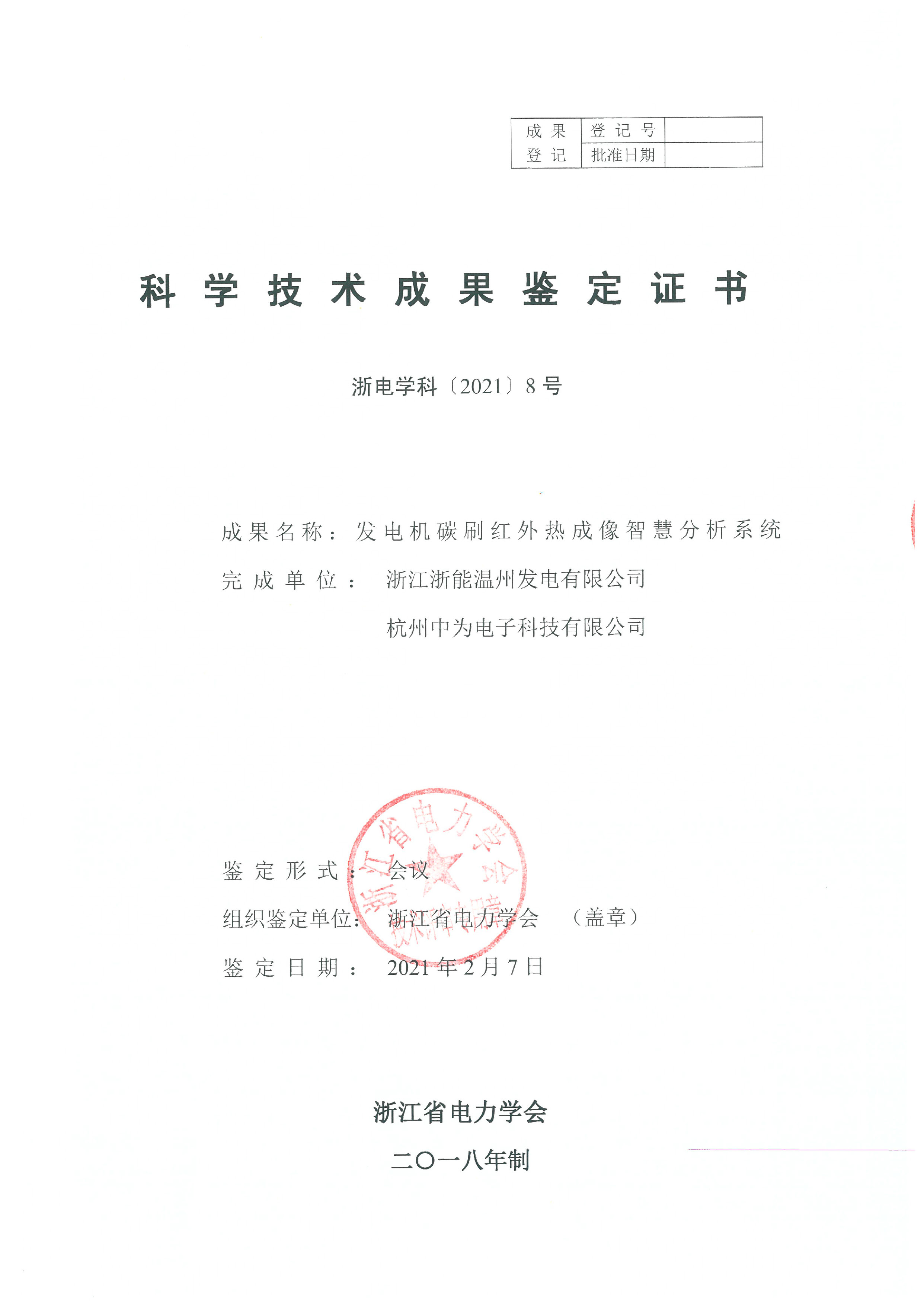 2021年2月7日,杭州中為電子科技有限公司牽頭浙江省電力學(xué)會相關(guān)專家在杭州市主持召開了浙江浙能溫州發(fā)電有限公司與杭州中為電子科技有限公司的合作項目《發(fā)電機碳刷紅外熱成像智慧分析系統(tǒng)》科技項目成果鑒定。經(jīng)鑒定委員會專家的鑒定,一致同意該科技項目通過科技成果鑒定。浙能溫州電廠技術(shù)總監(jiān)翁獻進、杭州中為電子科技有限公司技術(shù)部潘明澤共同為委員會做專項成果技術(shù)介紹,詳盡的為與會專家闡述了項目的關(guān)鍵技術(shù)和創(chuàng)新點。