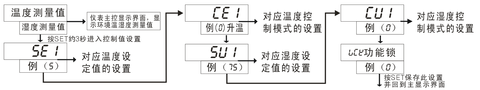 4、濕度控制模式“CU1”:可設(shè)置濕度啟控模式: 目前出廠設(shè)置默認(rèn)為除濕型。(如需加濕型啟控模式為特殊定貨,下單時(shí)特別說明)。